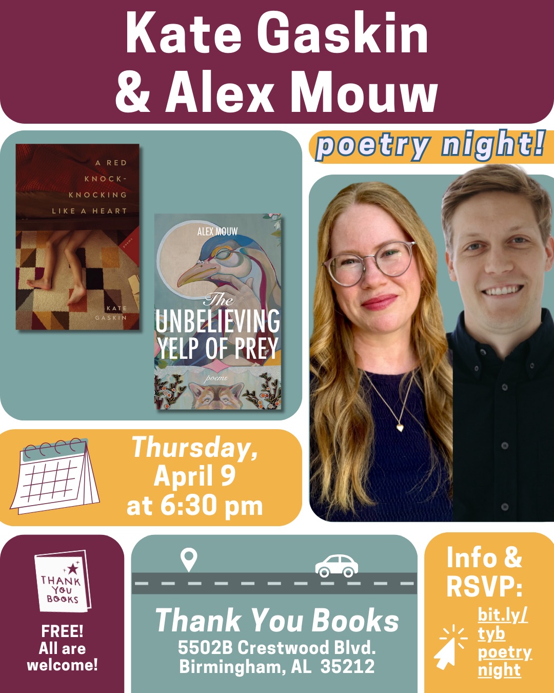 April 9th, 2026: Reading at Thank You Books at 6:30pm, Birmingham AL